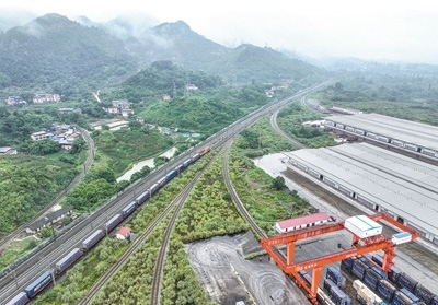 6月27日,西部陸海新通道中老泰馬跨境鐵路班列在重慶江津小南埡站發(fā)車(無人機(jī)照片)。該班列的開行將促進(jìn)通道沿線地區(qū)與東盟國(guó)家的經(jīng)貿(mào)合作和產(chǎn)業(yè)聯(lián)動(dòng)。新華社記者 唐 奕攝