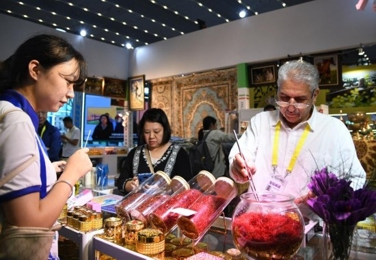 9月20日,來(lái)自伊朗的參展商(右一)向觀眾介紹產(chǎn)品。新華社記者 張博文 攝