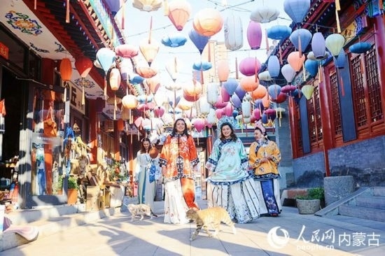 大盛魁博物館整體建筑風格為清末民國至上世紀40年代歸化城(今呼和浩特市)街區(qū)風貌。外媒記者“小姐姐”們現場“換裝”,體驗各式中華傳統(tǒng)服飾。來自巴勒斯坦國家電視臺的主持人拉尼婭·哈姆達拉,換了一身鮮艷的橘色服飾,行走園中,宛若“穿越”時光。