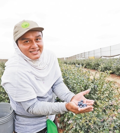 在秘魯特魯希略市一家農(nóng)場里,一名采摘工人在展示他剛摘下的藍莓。本報記者 顏 歡攝