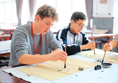 圖為活動期間,來自美國得克薩斯州圣史蒂芬圣公會學(xué)校的學(xué)生查爾斯·錢寧·達根(左)在河北衡水中學(xué)學(xué)習(xí)書法。