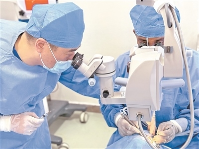 “光明行”項目專家團隊正在為當(dāng)?shù)鼗颊邔嵤┌變?nèi)障手術(shù)。