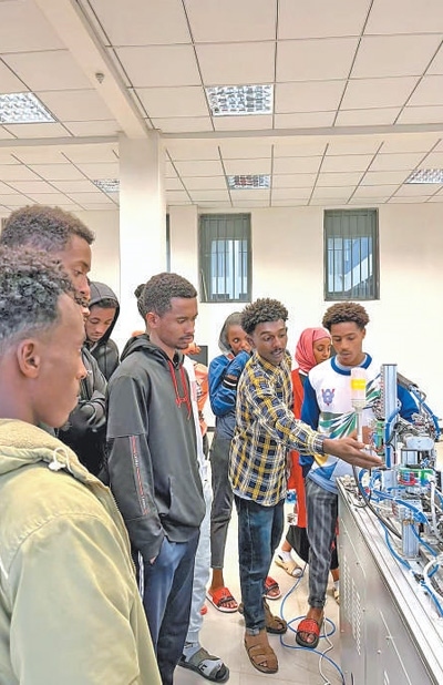 埃塞俄比亞魯班工坊當(dāng)?shù)亟處煘閷W(xué)生們講解機電一體化設(shè)備的操作方法。