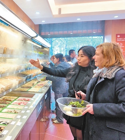 在柏林市中心,一家新開(kāi)不久的“楊國(guó)福麻辣燙”店門(mén)口,當(dāng)?shù)厝思{爾夫和幾個(gè)好友推門(mén)而入。店內(nèi)熱氣騰騰,空氣中彌漫著濃郁的骨湯香氣。在排隊(duì)取餐的人群中,不乏像納爾夫這樣的外國(guó)朋友。他們拿起夾子和菜盆,熟練地自選食材(見(jiàn)圖②,本報(bào)記者劉赫攝):藕片、菠菜、凍豆腐、寬粉、蝦和牛肉卷……幾分鐘后,一碗香氣四溢的麻辣燙被端上餐桌。