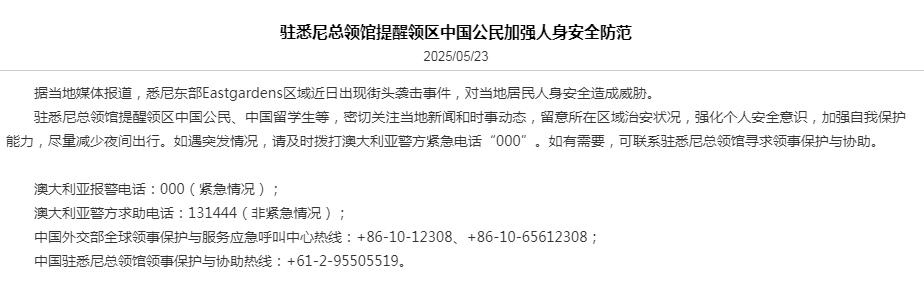 新華社悉尼5月23日電 中國駐悉尼總領館23日連續(xù)發(fā)布兩條提醒,提醒領區(qū)中國公民加強人身安全防范。