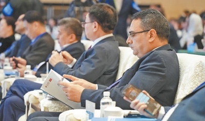 與會(huì)嘉賓在2025上合組織國家媒體合作論壇上,閱讀《共同的家園——上合組織成員國發(fā)展愿景民意調(diào)查報(bào)告》。