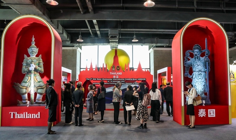 9月21日,在第八屆絲綢之路(敦煌)國際文化博覽會上,與會嘉賓參觀主賓國泰國展廳。