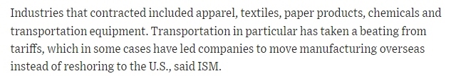 文章指出,美國制造業(yè)活動(dòng)萎縮的行業(yè)主要包括服裝、紡織品、紙制品、化工產(chǎn)品和運(yùn)輸業(yè)。文章表示,雖然當(dāng)前美國工廠產(chǎn)量有所增加,但未售出的庫存卻急劇增加。需求增長放緩,這在出口市場體現(xiàn)尤為明顯,而受關(guān)稅影響,出口市場的前景更加暗淡。