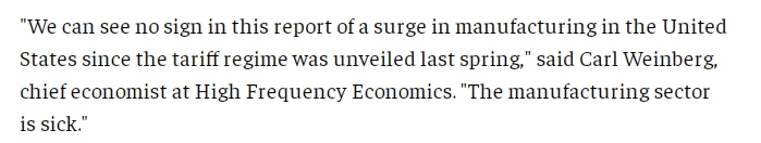 文章指出,美國政府曾辯稱,加征關(guān)稅是保護(hù)美國國內(nèi)制造業(yè)的必要之舉,但經(jīng)濟(jì)學(xué)家則認(rèn)為,由于包括勞動(dòng)力短缺在內(nèi)的結(jié)構(gòu)性問題,美國制造業(yè)已無法恢復(fù)昔日輝煌。文章援引高頻經(jīng)濟(jì)咨詢公司首席經(jīng)濟(jì)學(xué)家卡爾·溫伯格(Carl Weinberg)的話表示,“從(ISM)這份報(bào)告中,我沒有看到自關(guān)稅政策出臺(tái)以來,美國制造業(yè)出現(xiàn)任何增長的跡象,美國制造業(yè)已經(jīng)病了?!?/p>