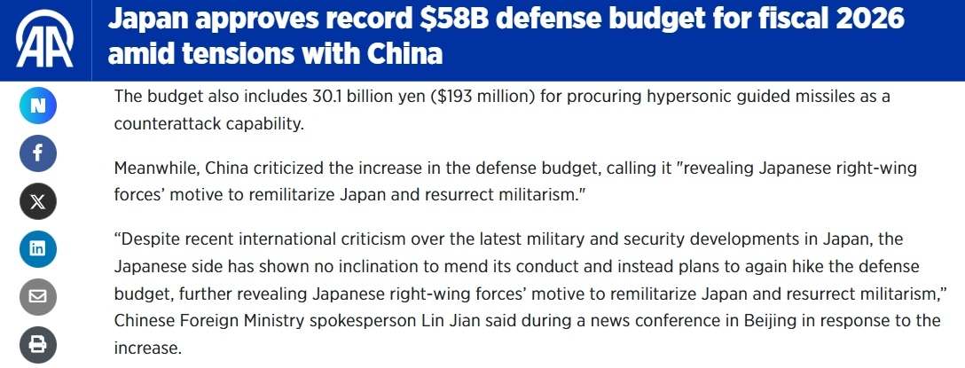 土耳其安納多盧通訊社26日的報(bào)道,列舉了日本創(chuàng)紀(jì)錄防衛(wèi)預(yù)算中涉及的方面,例如無(wú)人機(jī)、高超音速導(dǎo)彈和航空宇宙自衛(wèi)隊(duì)等。同時(shí),報(bào)道引述中方的批評(píng)稱,“近期國(guó)際社會(huì)對(duì)日本的軍事安全動(dòng)向,批評(píng)聲音不斷,日方不但沒(méi)有反省收斂,反而計(jì)劃再次大幅增加防衛(wèi)預(yù)算,更加暴露出日本右翼勢(shì)力推動(dòng)日本‘再軍事化’、企圖讓軍國(guó)主義死灰復(fù)燃的險(xiǎn)惡用心。”