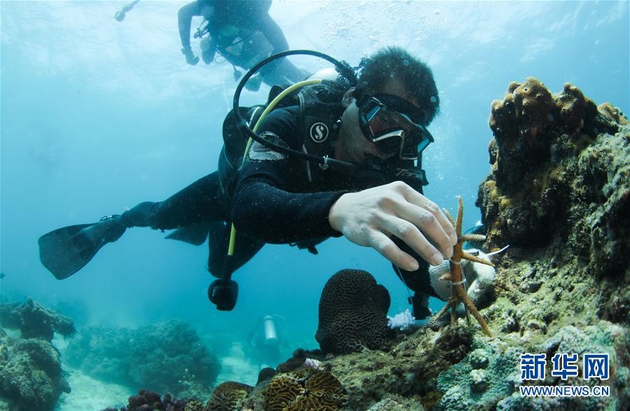 在海南三亞蜈支洲島海域,中科院南海海洋研究所副研究員張浴陽團(tuán)隊工作人員在海底的移植釘上固定珊瑚(4月28日攝)。新華社記者楊冠宇攝