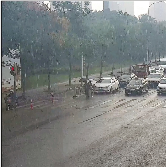 當老人好不容易快走到馬路對面時,天公不作美,突然下起瓢潑大雨,又一幕感人的瞬間出現(xiàn)了:一輛等候通行的小轎車上下來一名女司機,從后備廂拿出一把雨傘后,快步跑上前,遞到老人手里。