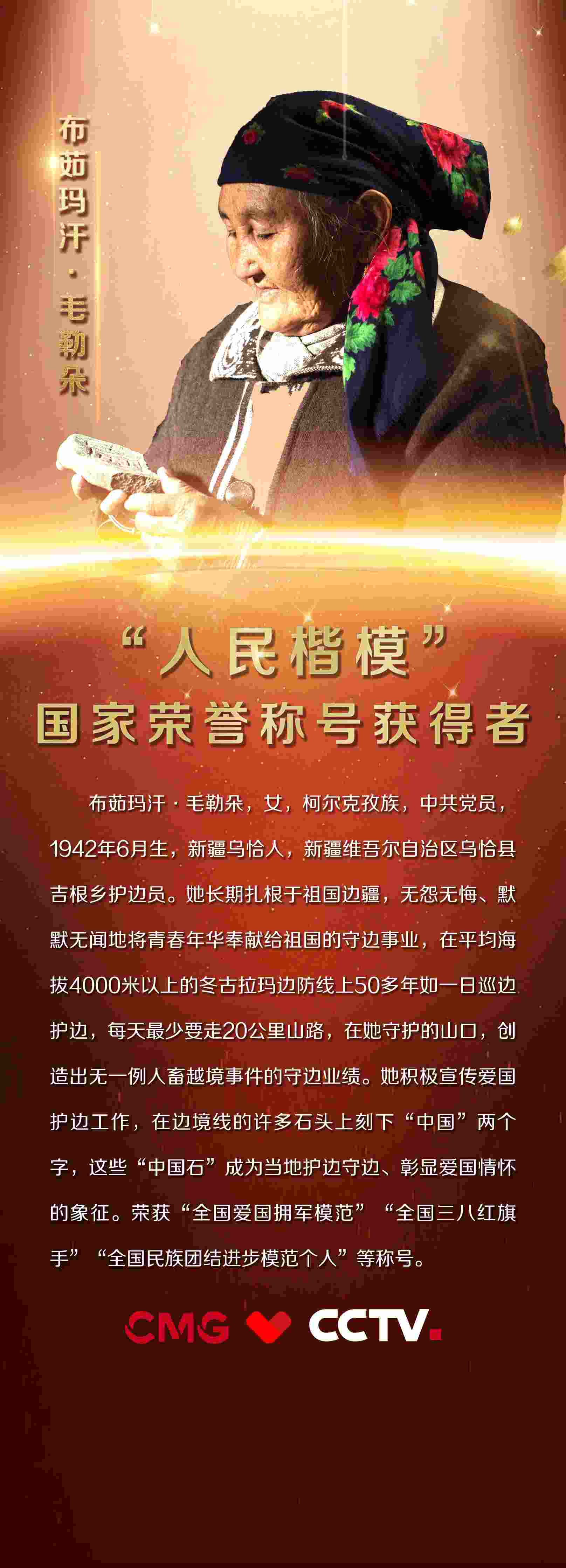 布茹瑪汗·毛勒朵,女,柯爾克孜族,中共黨員,1942年6月生,新疆烏恰人,新疆維吾爾自治區(qū)烏恰縣吉根鄉(xiāng)護(hù)邊員。她長(zhǎng)期扎根于祖國(guó)邊疆,無(wú)怨無(wú)悔、默默無(wú)聞地將青春年華奉獻(xiàn)給祖國(guó)的守邊事業(yè),在平均海拔4000米以上的冬古拉瑪邊防線上50多年如一日巡邊護(hù)邊,每天最少要走20公里山路,在她守護(hù)的山口,創(chuàng)造出無(wú)一例人畜越境事件的守邊業(yè)績(jī)。她積極宣傳愛國(guó)護(hù)邊工作,在邊境線的許多石頭上刻下“中國(guó)”兩個(gè)字,這些“中國(guó)石”成為當(dāng)?shù)刈o(hù)邊守邊、彰顯愛國(guó)情懷的象征。榮獲“全國(guó)愛國(guó)擁軍模范”“全國(guó)三八紅旗手”“全國(guó)民族團(tuán)結(jié)進(jìn)步模范個(gè)人”等稱號(hào)。