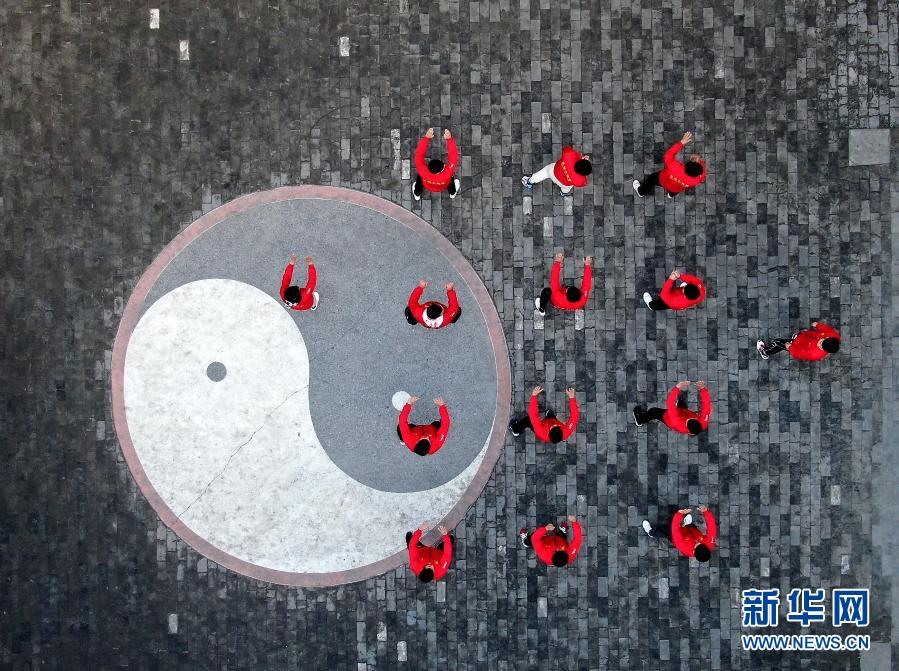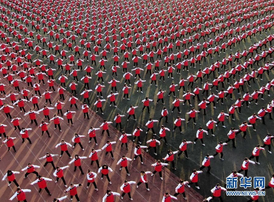 河南省焦作市溫縣第一高級中學的學生在操場上練拳(無人機照片,12月15日攝)。