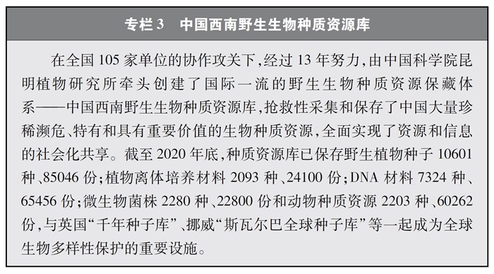 加快重要生物遺傳資源收集保存和利用。中國高度重視生物資源保護(hù),近年來在生物資源調(diào)查、收集、保存等方面取得較大進(jìn)展。實施戰(zhàn)略生物資源計劃專項,完善生物資源收集收藏平臺,建立種質(zhì)資源創(chuàng)新平臺、遺傳資源衍生庫和天然化合物轉(zhuǎn)化平臺,持續(xù)加強(qiáng)野生生物資源保護(hù)和利用。實施一批種質(zhì)資源保護(hù)和育種創(chuàng)新項目,截至2020年底,形成了以國家作物種質(zhì)長期庫及其復(fù)份庫為核心、10座中期庫與43個種質(zhì)圃為支撐的國家作物種質(zhì)資源保護(hù)體系,建立了199個國家級畜禽遺傳資源保種場(區(qū)、庫),為90%以上的國家級畜禽遺傳資源保護(hù)名錄品種建立了國家級保種單位,長期保存作物種質(zhì)資源52萬余份、畜禽遺傳資源96萬份。建設(shè)99個國家級林木種質(zhì)資源保存庫,以及新疆、山東2個國家級林草種質(zhì)資源設(shè)施保存庫國家分庫,保存林木種質(zhì)資源4.7萬份。建設(shè)31個藥用植物種質(zhì)資源保存圃和2個種質(zhì)資源庫,保存種子種苗1.2萬多份。