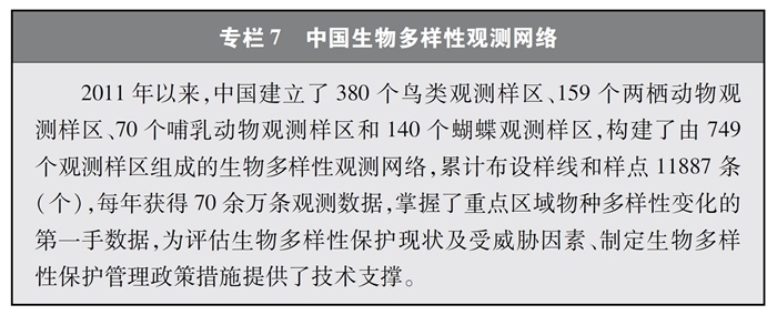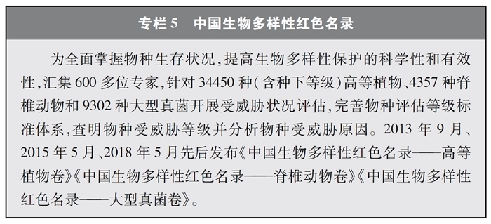 開展全國生物多樣性調(diào)查與評估。大力推進(jìn)生物多樣性保護(hù)重大工程實施,結(jié)合自然資源調(diào)查、生態(tài)系統(tǒng)監(jiān)測評估等工作,不斷完善生物多樣性調(diào)查與評估能力,首次將生物多樣性指標(biāo)納入生態(tài)質(zhì)量綜合評價指標(biāo)體系,引導(dǎo)地方加強(qiáng)生態(tài)文明建設(shè)與生物多樣性保護(hù)。開展自然資源調(diào)查,包括森林、草原、水、濕地、荒漠、海洋等,建立自然資源調(diào)查評價監(jiān)測制度。構(gòu)建了涵蓋2376個縣級行政單元、樣線總長超過3.4萬公里的物種分布數(shù)據(jù)庫,建立物種資源調(diào)查及收集信息平臺,準(zhǔn)確反映野生動植物空間分布狀況。完成長江經(jīng)濟(jì)帶、京津冀等國家戰(zhàn)略區(qū)域180多個縣級行政區(qū)生物多樣性調(diào)查與評估。組織開展近海漁業(yè)資源調(diào)查,初步掌握近海漁業(yè)資源狀況。陸續(xù)發(fā)布《中國植物紅皮書》《中國瀕危動物紅皮書》《中國物種紅色名錄》《中國生物多樣性紅色名錄》,基本掌握生物多樣性總體情況,為加強(qiáng)生物多樣性保護(hù)奠定了科學(xué)基礎(chǔ)。