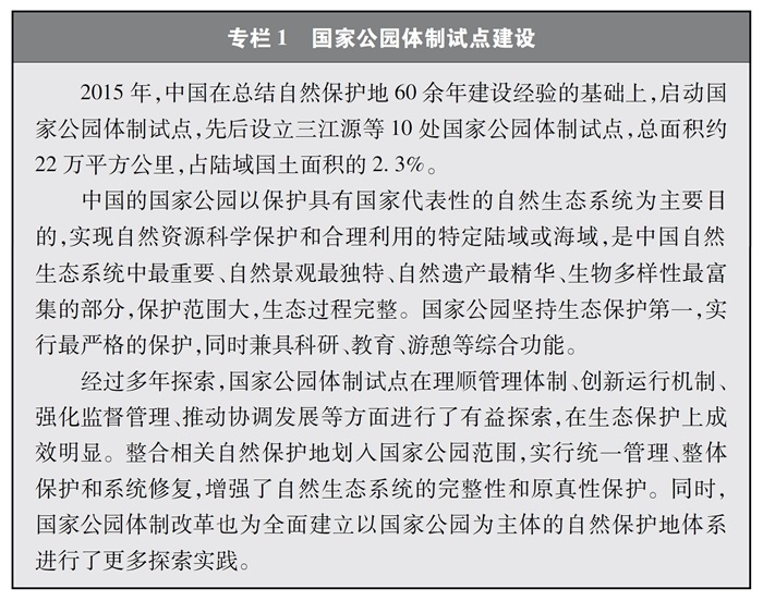 中國不斷推進(jìn)自然保護(hù)地建設(shè),啟動國家公園體制試點,構(gòu)建以國家公園為主體的自然保護(hù)地體系,率先在國際上提出和實施生態(tài)保護(hù)紅線制度,明確了生物多樣性保護(hù)優(yōu)先區(qū)域,保護(hù)了重要自然生態(tài)系統(tǒng)和生物資源,在維護(hù)重要物種棲息地方面發(fā)揮了積極作用。