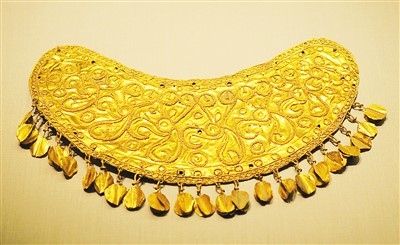 展廳里有不少光彩照人的漢代金飾品,體現(xiàn)了多元文明的融匯。一套出土于鄂爾多斯的金鑲貝玉首飾,由長(zhǎng)方形鹿紋金飾牌、方形嵌蚌金串飾、包金玉佩等組成,其中的鹿紋是典型的草原風(fēng)格紋飾,嵌蚌及其周圍的連珠紋工藝則具有波斯等西方文明的工藝特征。一塊出土于通遼的金飾牌,是薩滿主持祭祀活動(dòng)時(shí)佩戴的飾件,中間雕有一高鼻深目、頭戴尖頂帽的女性,兩側(cè)各有一只怪獸,與西伯利亞地區(qū)出土的雙獅守護(hù)圣樹金飾牌極為相似。