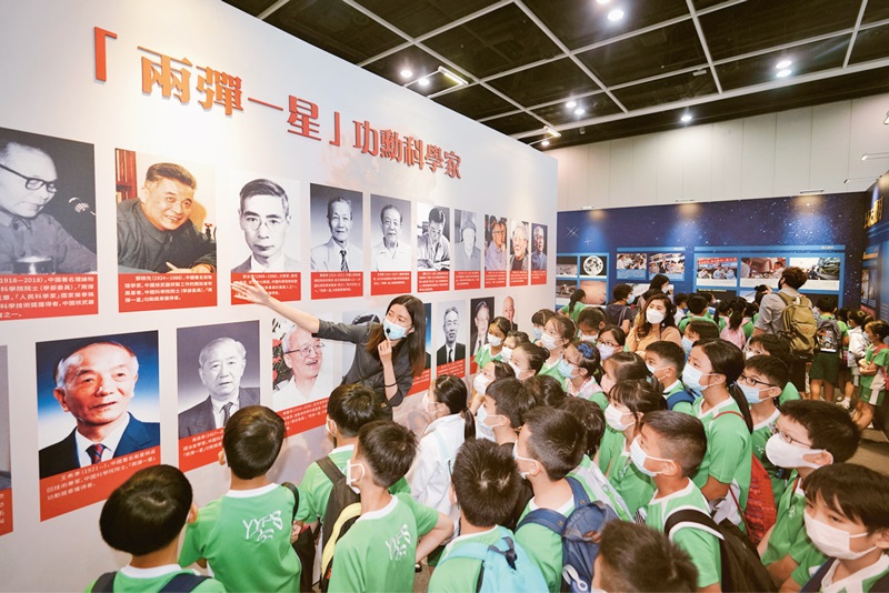 2021年6月27日至7月9日,“時代精神耀香江”之百年中國科學(xué)家主題展在香港向公眾開放。圖為7月7日,眾多小學(xué)生仔細(xì)聆聽講解員的介紹。中新社記者張煒/攝