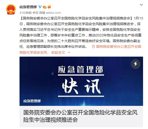 據(jù)應(yīng)急管理部官方微博消息,近日國務(wù)院安委會(huì)辦公室召開全國危險(xiǎn)化學(xué)品安全風(fēng)險(xiǎn)集中治理視頻推進(jìn)會(huì),會(huì)議明確指出要保持高度警覺,加強(qiáng)監(jiān)督檢查和明查暗訪,落實(shí)各項(xiàng)安全防范措施,嚴(yán)格領(lǐng)導(dǎo)帶班和值班值守,切實(shí)抓好歲末年初危化品安全生產(chǎn)工作,堅(jiān)決防范各類事故發(fā)生。