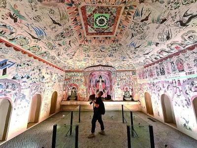2021年9月17日,參觀者在北京故宮展覽的敦煌莫高窟第285窟復(fù)制洞窟內(nèi)參觀。新華社發(fā)
