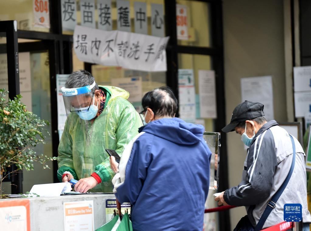 2月22日,在香港佐敦疫苗接種中心站,市民佩戴口罩排隊接種疫苗。新華社記者 盧炳輝 攝