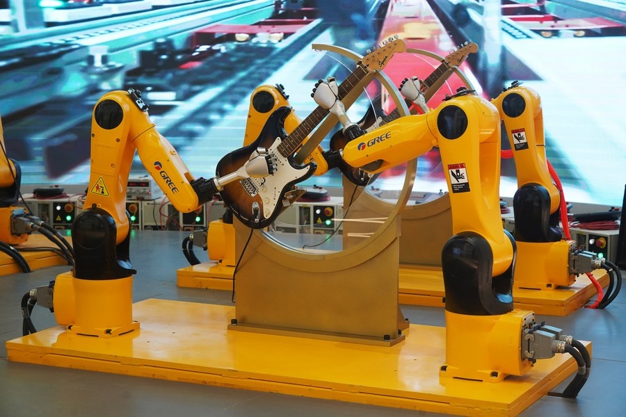 在贛州市格力小鎮(zhèn),機(jī)器人樂(lè)隊(duì)演奏音樂(lè)。新華社記者 萬(wàn)象攝