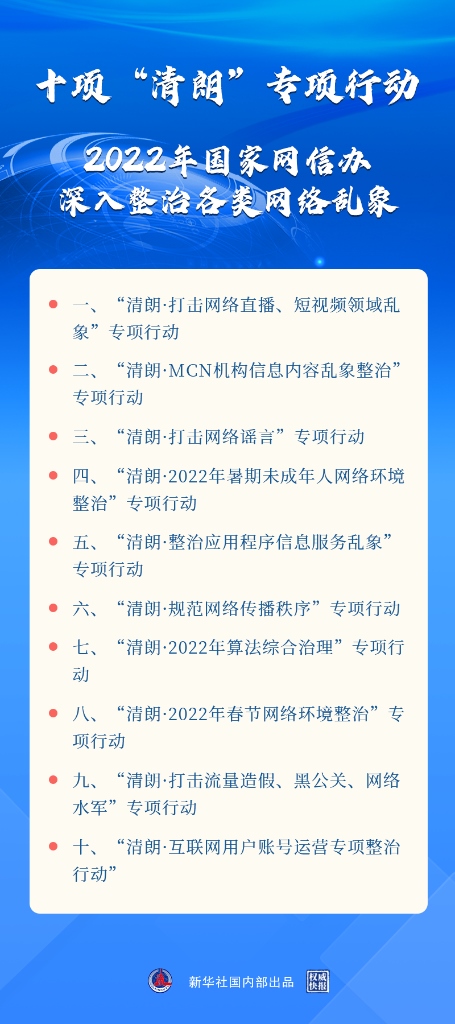 新華社北京3月17日電(記者王思北)記者17日從國(guó)新辦舉行的新聞發(fā)布會(huì)獲悉,2022年“清朗”系列專項(xiàng)行動(dòng)將重點(diǎn)開展打擊網(wǎng)絡(luò)謠言,打擊網(wǎng)絡(luò)直播、短視頻領(lǐng)域亂象,算法綜合治理,暑期未成年人網(wǎng)絡(luò)環(huán)境整治等十方面任務(wù)?! ?/p>