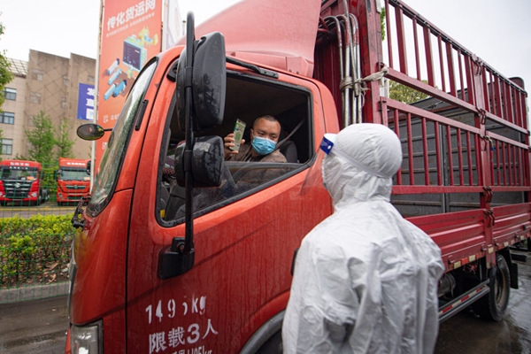 4月13日,工作人員查驗駛?cè)牒贾輦骰犯鄣呢涇囁緳C(jī)健康碼。新華社記者江漢攝