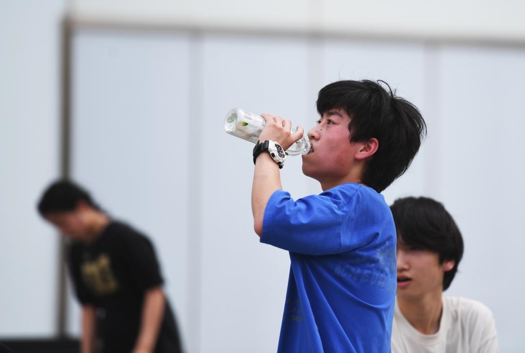 6月21日,在河南省鄭州市金水區(qū)花園路,男孩在運動后補水。新華社記者張浩然攝