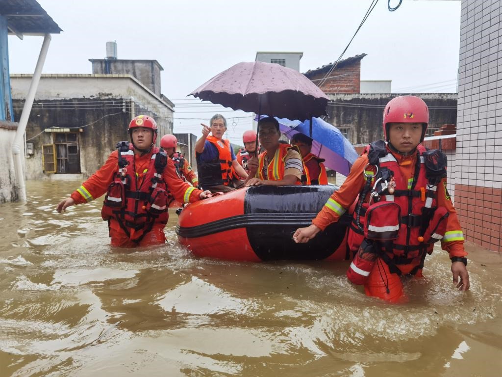 6月21日,在廣東韶關(guān)市曲江區(qū)樟市鎮(zhèn)鐵廠村,消防救援人員轉(zhuǎn)移被困群眾。(新華社發(fā)周思濤攝)