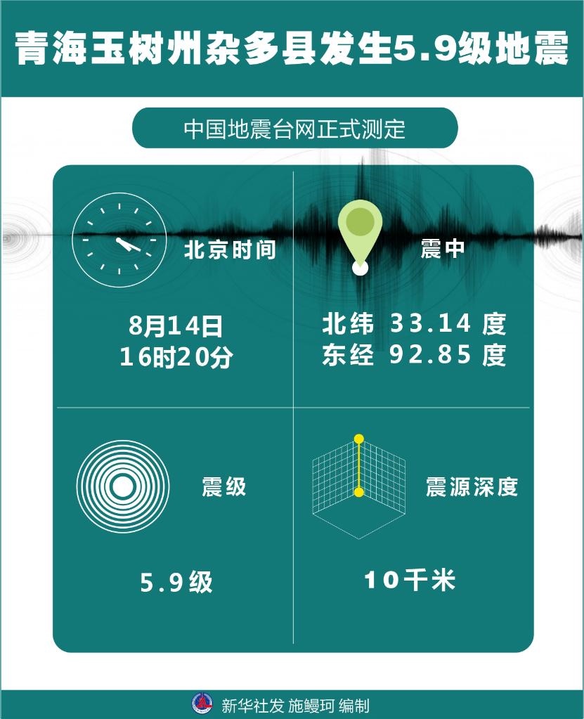 新華社西寧8月14日電(記者陳杰、王艷)記者從青海省地震局獲悉,8月14日16時20分,青海省玉樹藏族自治州雜多縣發(fā)生5.9級地震,震源深度10千米,震中位于北緯33.14度、東經(jīng)92.85度。目前,暫無人員傷亡消息。