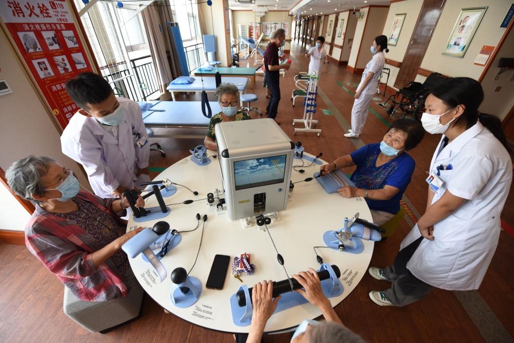 8月5日,在山東日照頤養(yǎng)公寓,醫(yī)生指導(dǎo)老人通過手功能綜合康復(fù)訓(xùn)練平臺(tái)進(jìn)行手指鍛煉。新華社記者范長(zhǎng)國(guó)攝