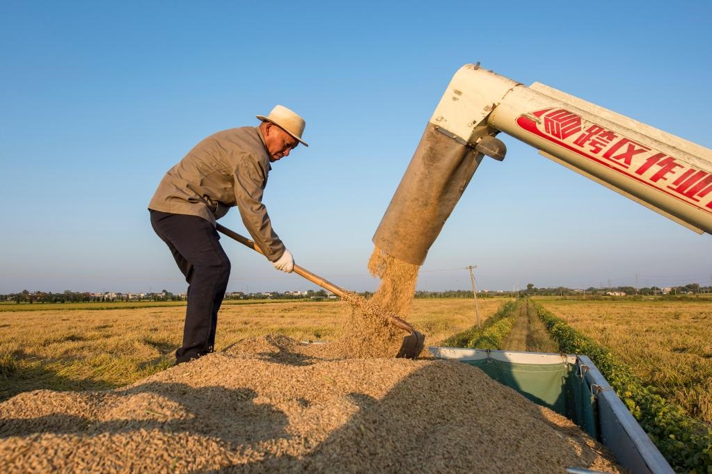 在蕪湖市繁昌區(qū)平鋪鎮(zhèn),村民將收割的水稻裝車。新華社發(fā)(肖本祥 攝)