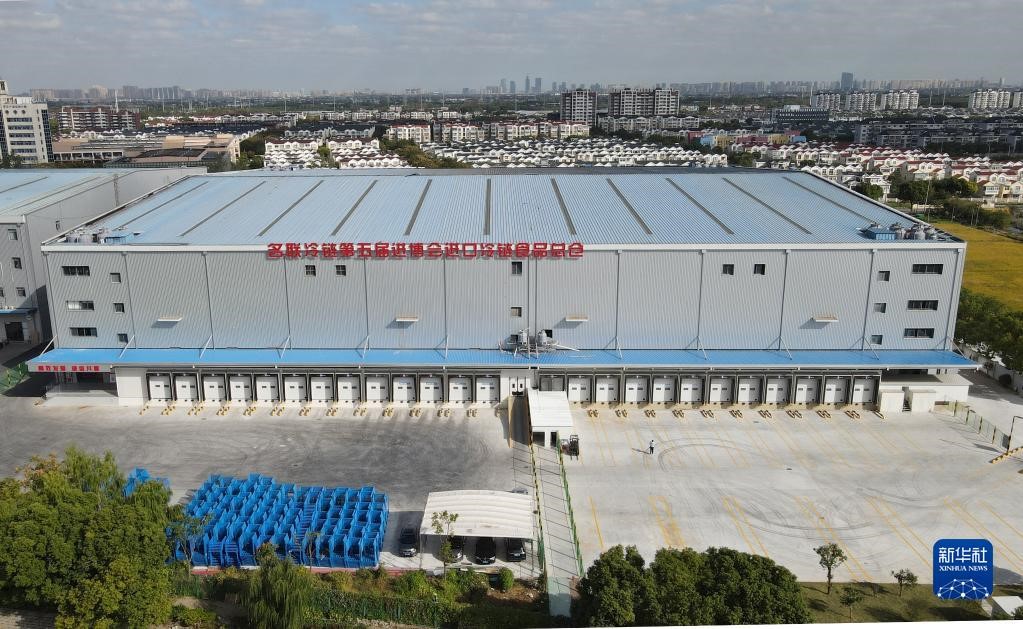 10月20日,空中俯瞰位于上海青浦區(qū)的名聯(lián)冷鏈第五屆進(jìn)博會(huì)進(jìn)口冷鏈?zhǔn)称房倐}(cāng)(無人機(jī)照片)。新華社記者 方喆攝