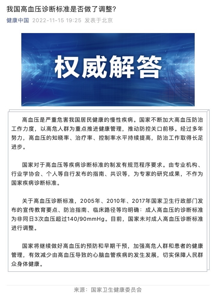 關(guān)于高血壓診斷標(biāo)準(zhǔn),2005年、2010年、2017年國家衛(wèi)生行政部門發(fā)布的宣傳教育要點、防治指南、臨床路徑等均明確:成人高血壓的診斷標(biāo)準(zhǔn)為非同日3次血壓超過140/90mmHg。目前,國家未對成人高血壓診斷標(biāo)準(zhǔn)進行調(diào)整。