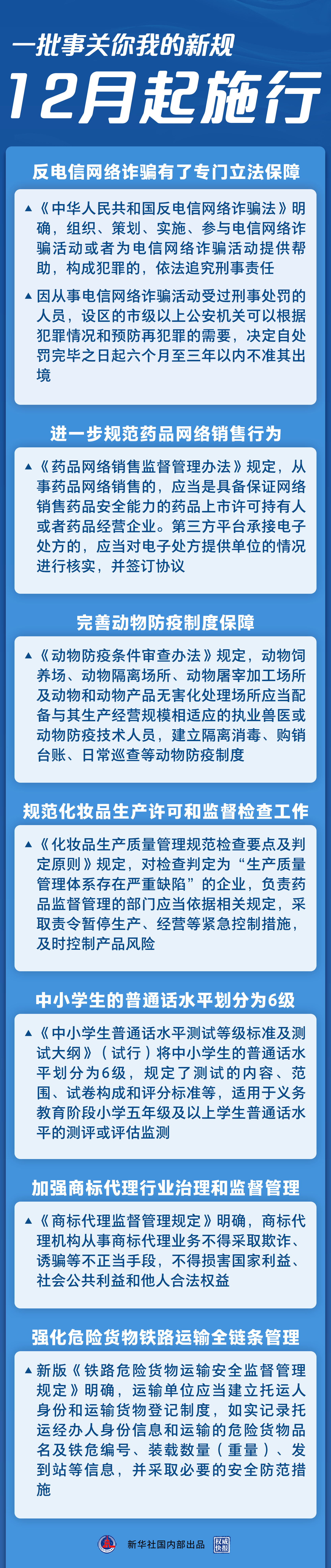2022年的最后一個月,一批事關(guān)你我的新規(guī)開始施行。反電信網(wǎng)絡(luò)詐騙有了專門立法保障,中小學(xué)生的普通話水平有了規(guī)范標(biāo)準(zhǔn),藥品網(wǎng)絡(luò)銷售平臺責(zé)任進(jìn)一步壓實(shí)……法治,為美好生活助力。