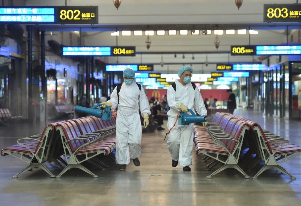 北京站工作人員在候車大廳進(jìn)行消殺作業(yè)(2020年6月18日攝)。新華社記者 陳鐘昊 攝