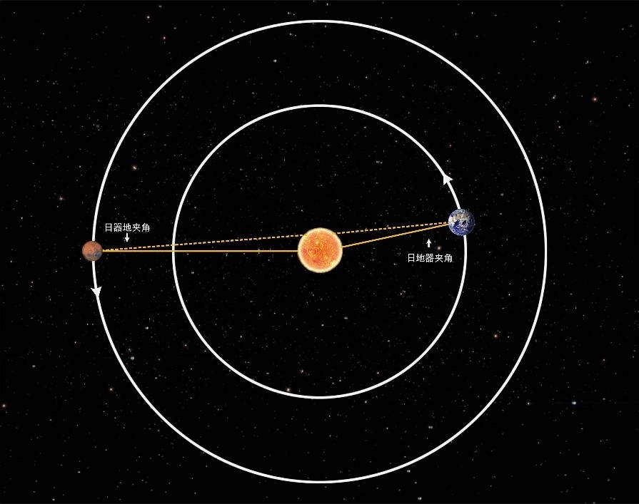 火星日凌期間,地球、火星與太陽之間的位置關系示意圖。(受訪對象供圖)