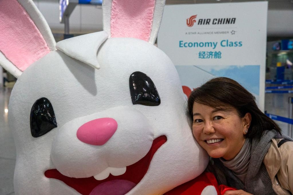 1月26日,在希臘雅典國際機(jī)場,一名準(zhǔn)備搭乘航班前往中國的乘客與裝扮成兔子造型的工作人員合影。(新華社發(fā),馬里奧斯·羅洛斯攝)