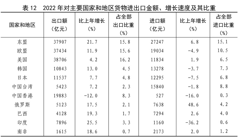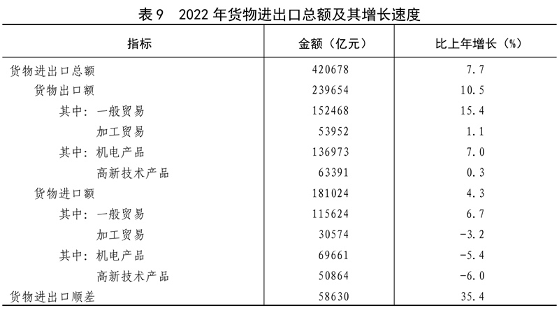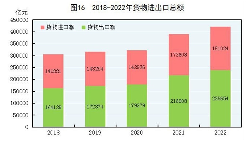 全年貨物進(jìn)出口總額420678億元,比上年增長7.7%。其中,出口239654億元,增長10.5%;進(jìn)口181024億元,增長4.3%。貨物進(jìn)出口順差58630億元,比上年增加15330億元。對“一帶一路”[40]沿線國家進(jìn)出口總額138339億元,比上年增長19.4%。其中,出口78877億元,增長20.0%;進(jìn)口59461億元,增長18.7%。對《區(qū)域全面經(jīng)濟(jì)伙伴關(guān)系協(xié)定》(RCEP)其他成員國[41]進(jìn)出口額129499億元,比上年增長7.5%。