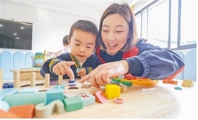 浙江省湖州市德清縣阜溪街道興山未來(lái)社區(qū)嬰幼兒照護(hù)驛站,幼兒在志愿者指導(dǎo)下拼搭積木。王樹(shù)成攝(影像中國(guó))
