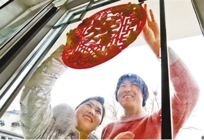 甘肅省張掖市臨澤縣鴨暖鎮(zhèn)屯泉小鎮(zhèn)彩蝶灣社區(qū),剛剛遷進(jìn)新居的村民在窗戶上貼窗花。王 將攝(影像中國(guó))