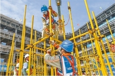 海南省建筑業(yè)職工職業(yè)技能競(jìng)賽暨質(zhì)量安全現(xiàn)場(chǎng)觀摩交流會(huì)現(xiàn)場(chǎng),建筑工人正在進(jìn)行架體搭設(shè)競(jìng)賽??档橇軘z(影像中國(guó))
