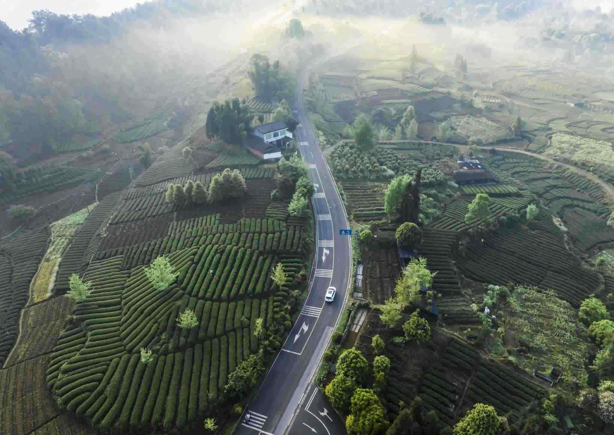 2023年4月12日,成都,邛崍市夾關(guān)鎮(zhèn)鄉(xiāng)村薄霧輕旋,青山蒼翠。視覺(jué)中國(guó)