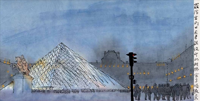 羅浮宮門口貝聿銘設(shè)計(jì)的玻璃金字塔夜景 35cm×68cm 1993 年