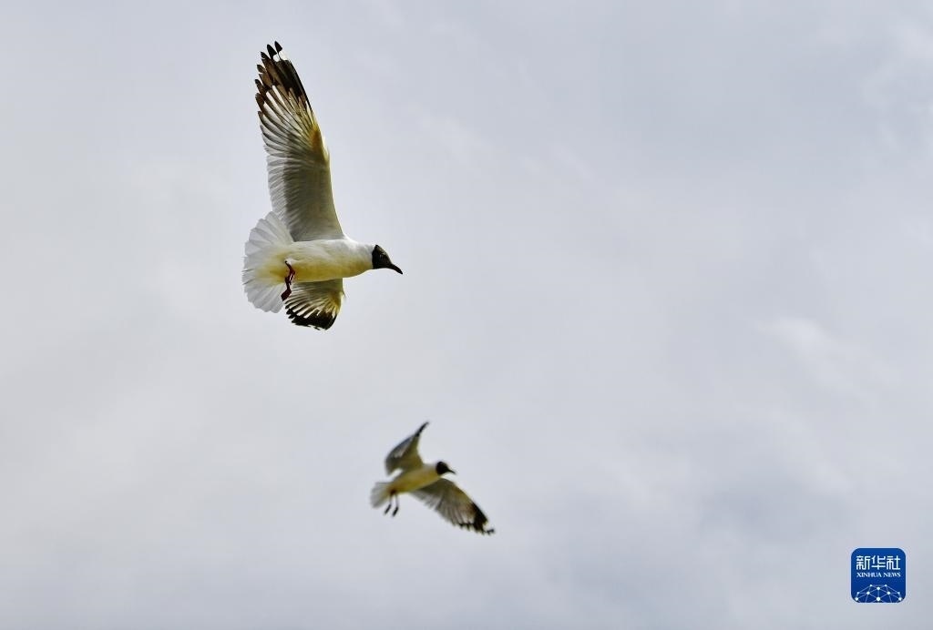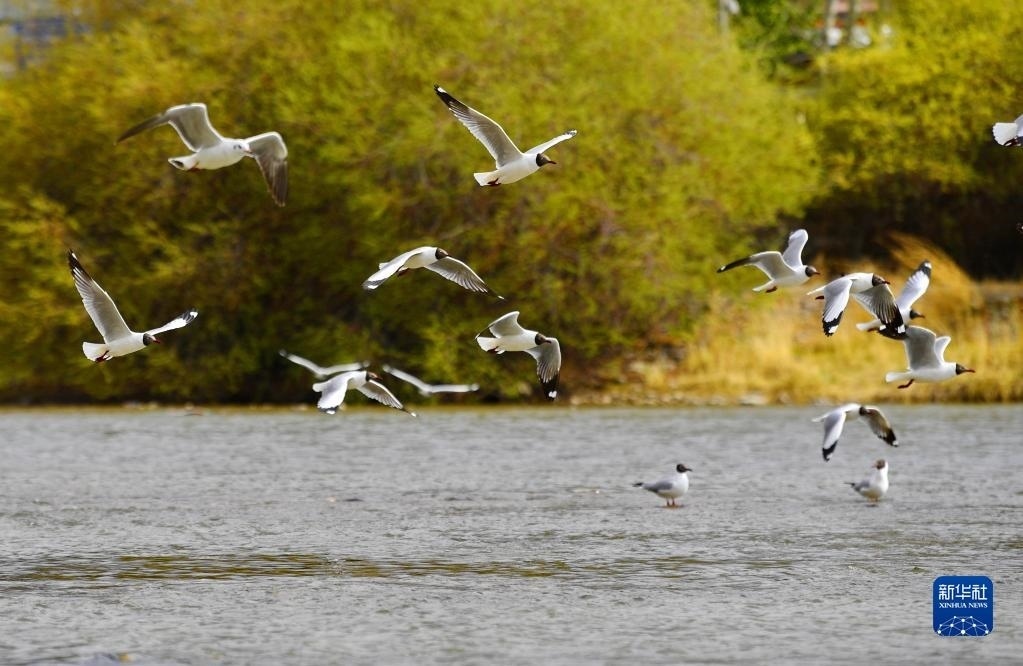 棕頭鷗在拉薩河上空飛翔(4月16日攝)。