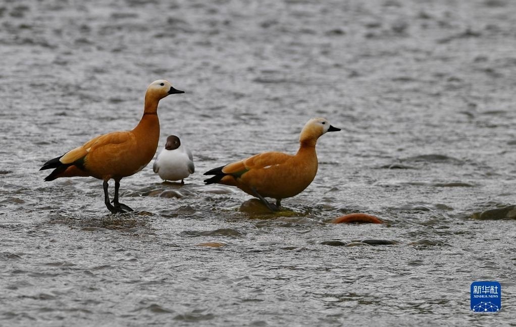 拉薩河上的赤麻鴨和棕頭鷗(4月16日攝)。
