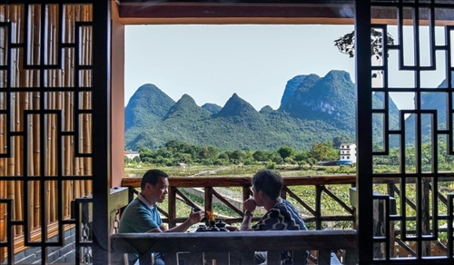 游客在廣西桂林市陽(yáng)朔縣一家民宿喝茶聊天(2020年7月4日攝) 曹祎銘攝/本刊