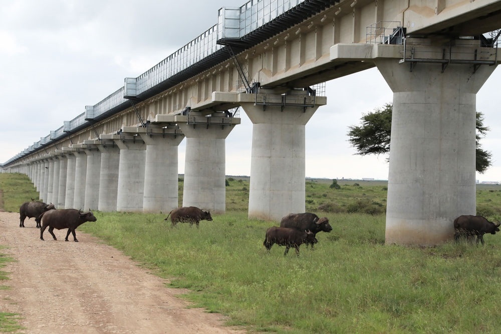 水牛在裝有聲屏障的肯尼亞內(nèi)羅畢國家公園特大橋下穿行(2021年5月19日攝)。中非共建的肯尼亞內(nèi)馬鐵路采用特大橋全程穿越內(nèi)羅畢國家公園方案,橋墩超過6米,讓長頸鹿也能“昂首通過”;特大橋護欄兩側(cè)安裝聲屏障,極大降低火車通過時的噪音。